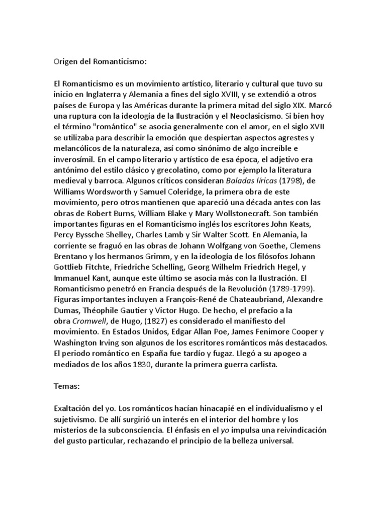 El romanticismo también renovó y enriqueció el limitado lenguaje y estilo del neoclasicismo, dando entrada a lo exótico y lo extravagante, buscando nuevas combinaciones métricas y flexibilizando las. En la primera mitad del siglo el nacionalismo tiene un caracter esencialmente defensivo. Surgió a finales del siglo xviii por influencias de la revolución francesa y la americana. En el romanticismo aparece una cierta obsesión por buscar las raíces de cada pueblo en su historia, en su literatura, en su cultura,. Jump to navigation jump to search.